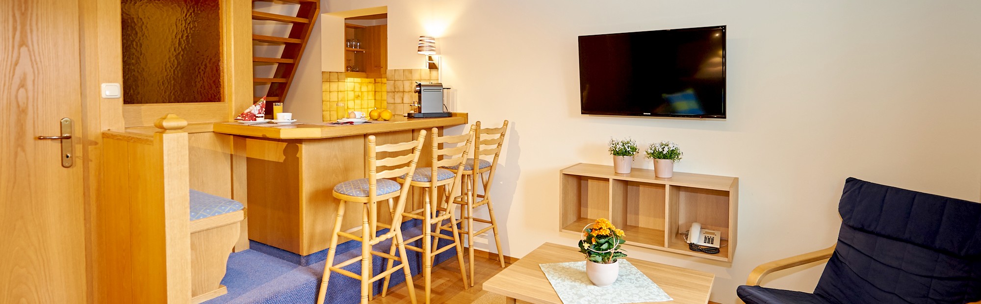 Living room with a seating area in an apartment of the Pension Panorama, Wagrain